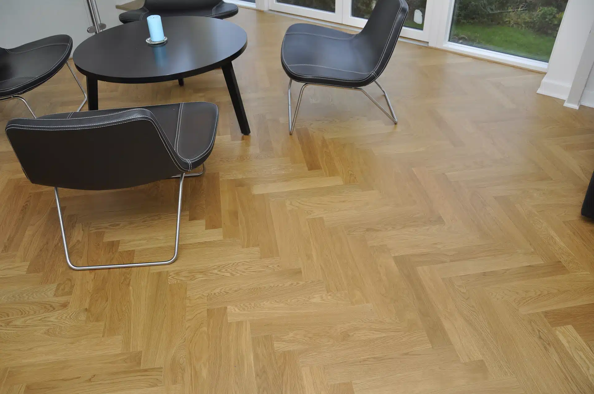 Sildebensmønsteret giver et smukt og dynamisk spil mellem stavparkettens naturlige åretegning og trækker naturens facetter direkte ind i husets hjerte. Et massivt sildebensparket bidrager til varme og dybde i husets store leverum.